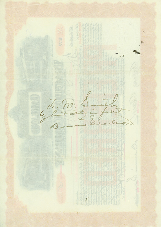 Oakland, 03.10.1911, 5 Shares of Preferred Capital Stock, #4577, Knickfalten, rückseitig einige kleinere Tintenflecke, 2x Original-Signatur von Dennis Searles als First Vice President (Vorderseite) sowie zusammen mit dem Aktieninhaber (Rückseite)! | |||