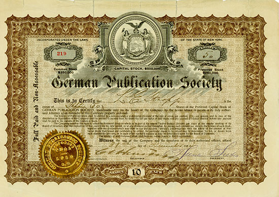 a) State of New York, 31.12.1914, 20 Shares of Preferred Stock á US-$ 10, #221, Knickfalten mit Randeinrissen bis 5 cm, goldfarbenes Siegel, Original-Signatur von Theodore Sutro (1845-1927, ältester Bruder des durch den Bau des Sutro Tunnels bekannten Adolph Sutro) als President; b) wie a), nur 50 Shares of Common Stock á US-$ 10, #219. | |||