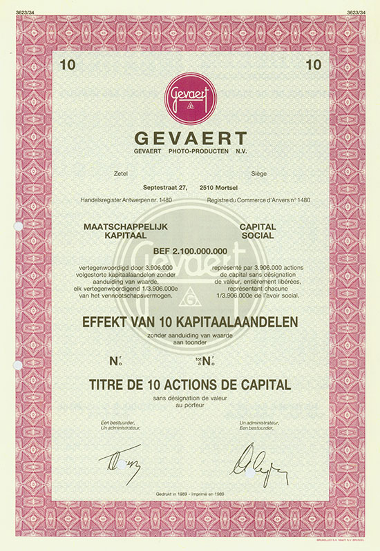 a) Mortsel, 1989, Specimen eines Effekt van 10 Kapitaalaandelen, o. Nr., Abheftlochung, zweisprachig: Holländisch, Französisch, KB; b) wie a), nur Effekt van 25 Kapitaalaandelen. | |||