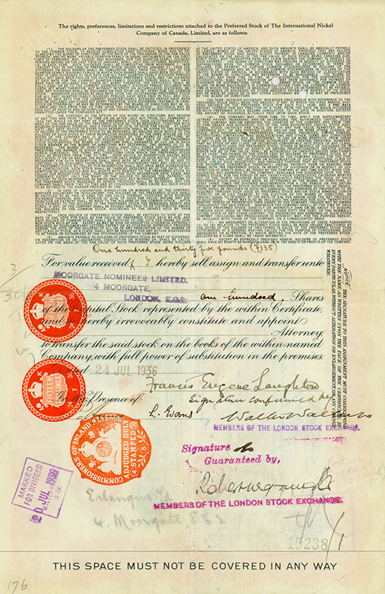 11 May 1936, 100 Shares of US-$ 5, #TC3495, folds, stamp cancelled, a bit soiling, superb vignette, issued to and signed on reverse by Francis Eugene Laughton. | |||