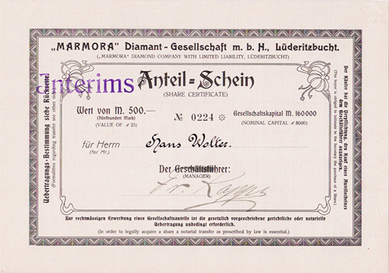 Die "MARMORA" Diamant-Gesellschaft mit beschränkter Haftung war ein Unternehmen, das sich in der historischen Region Lüderitzbucht, heutzutage bekannt als Lüderitz in Namibia, etablierte. Dieser Ort war einst berühmt für seine Diamantenvorkommen und zog im frühen 20. Jahrhundert zahlreiche Investoren und Unternehmen an, die im aufkommenden Diamantenrausch ihr Glück suchten. Die Geschichte der MARMORA Diamant-Gesellschaft ist eng mit der Kolonialgeschichte des Deutschen Reiches in Südwestafrika verknüpft. Nachdem der deutsche Kaufmann Adolf Lüderitz in den 1880er Jahren Land von den einheimischen Nama erworben hatte, begann die deutsche Kolonisierung des Gebietes. Der Fund von Diamanten nahe Lüderitz im Jahr 1908 löste einen Diamantenboom aus, und viele Gesellschaften wurden gegründet, um diese Edelsteine zu fördern. Die MARMORA Diamant-Gesellschaft mit einem Stammkapital von 160.000 Mark war eines dieser Unternehmen, das in den Diamantenhandel und die -gewinnung investierte. Die Firma gab Anteilscheine heraus, die den Investoren einen Anspruch auf einen Teil des Unternehmens und seiner Gewinne gewährten. Diese Anteilscheine repräsentierten eine wichtige Form der Finanzierung für das Unternehmen, da sie Kapital für den Kauf von Ausrüstung, die Einstellung von Arbeitskräften und die Erschließung von Minen bereitstellten. | ||||||||