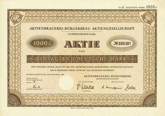 a) Ludwigshafen/Rh., Oktober 1952, Aktie über 100 DM, Lit. B, #533, leichte Knickfalte, sonst EF; b) wie a), nur 1.000 DM, Lit. A, #301, Schätzpreis: 75 €. | ||||||||||||||||||||||||||||||||